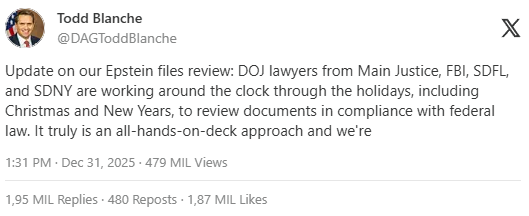 On December 19, the deadline for the DOJ to release the files as required by the law, Blanche said in an interview on Fox News that the DOJ would not be meeting the deadline. “I expect that we’re going to release more documents over the next couple of weeks, so today several hundred thousand and then over the next couple weeks, I expect several hundred thousand more,” Blanche said. “There’s a lot of eyes looking at these and we want to make sure that… when we do produce the materials we’re producing, that we’re protecting every single victim.”