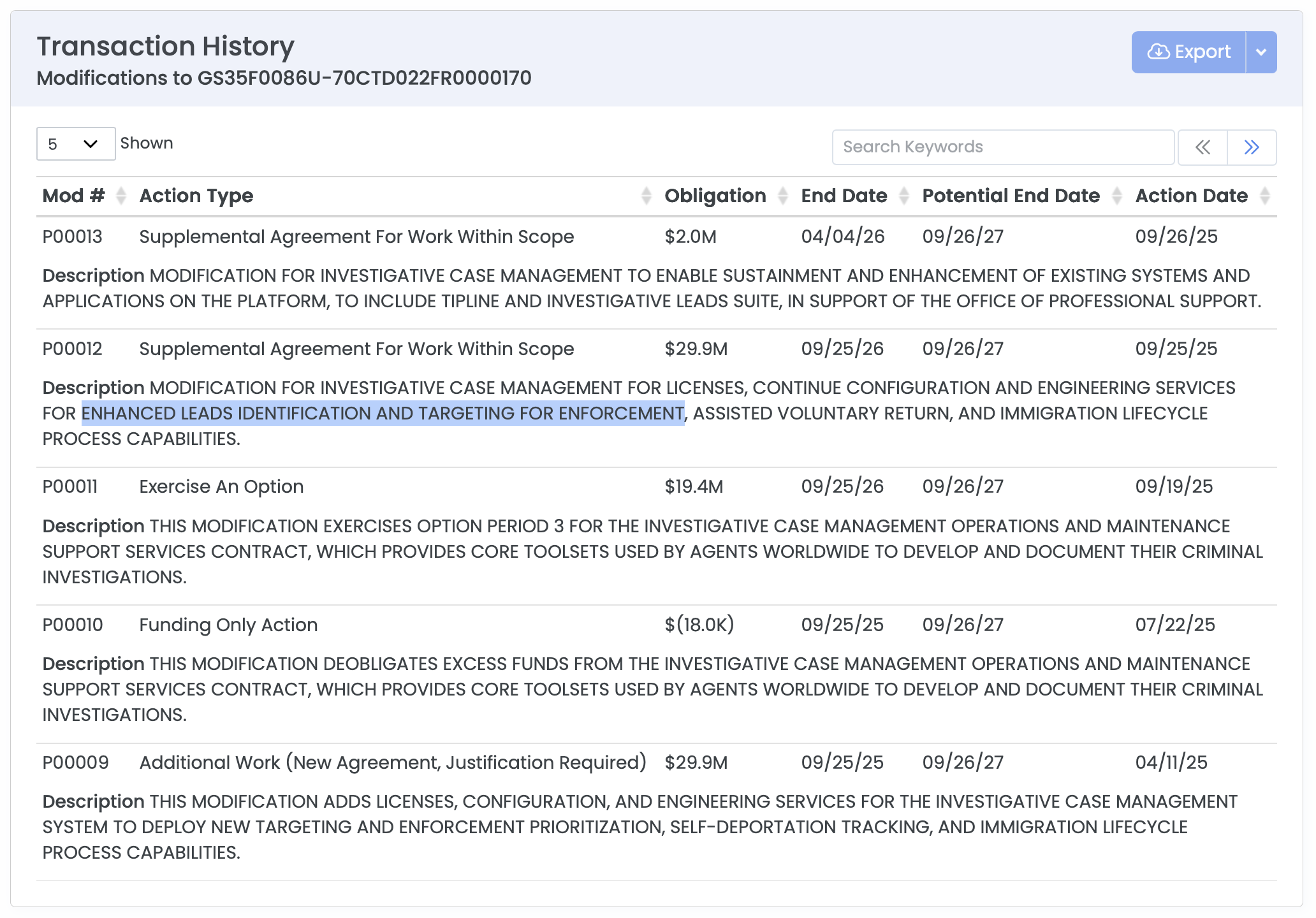 The ELITE user guide does not say who developed the system. But the tool’s distinctive title—Enhanced Leads Identification & Targeting for Enforcement—exactly matches one included in an addendum to a Palantir contract from last year. It says Palantir should “continue configuration and engineering services” for ELITE and some other ICE tools. That supplemental agreement for $29.9 million started in September and is planned to go on for at least a year.