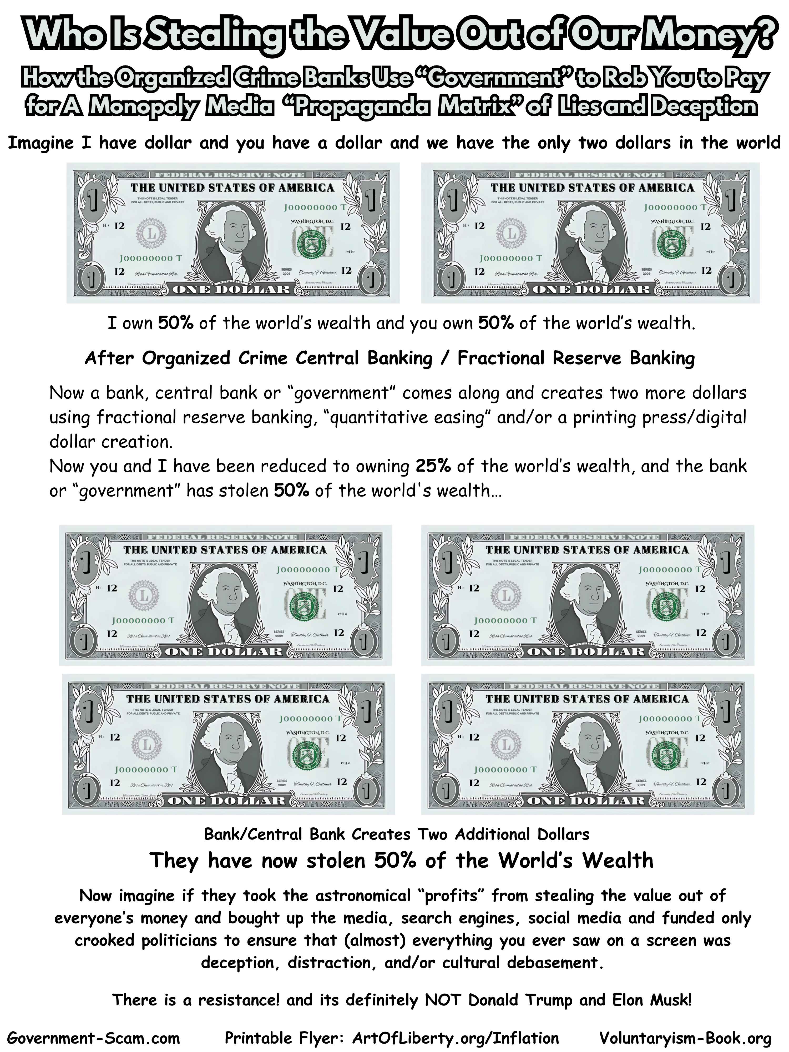 It’s a form of economic warfare against the population, and they don’t want the population to have independent wealth. They don’t want people to be independent. They want them dependent upon either the government or the corporations that have been monopolized by the fractional reserve system. And so the, you know, just one more analogy that I like to use about fractional reserve banking, you know, imagine if I have a dollar and you dear, you know, viewer or listener have a dollar and those two dollars, the only dollars in the world.