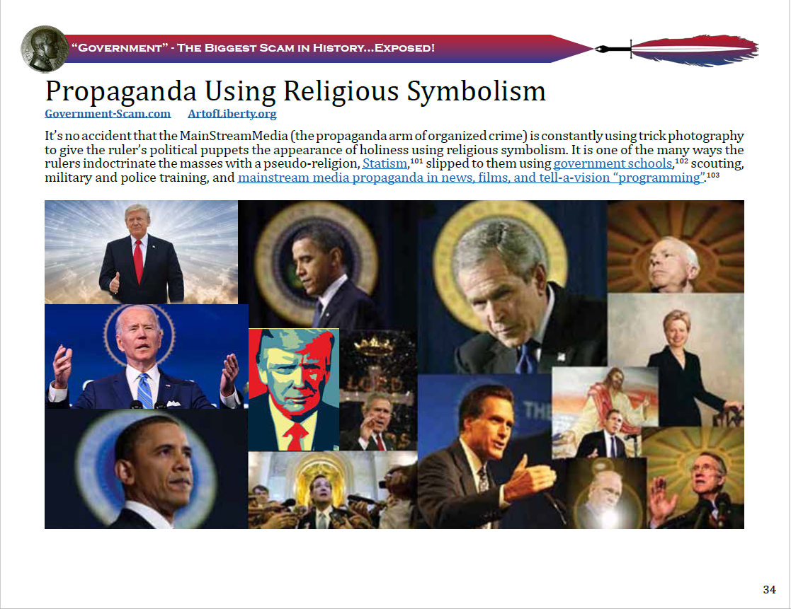 Go ahead. So what I’m doing with the books is, so I understand the way that people learn, most people are visual learners. And so I know a lot of your audience already knows this, and I didn’t make the book for you. What I did is I made the book for your friends, your family, and your relatives who might not understand that this is going on. And one of the things about the human brain, human beings, is they’re really, really good pattern recognition machines. And so the technique that Barrett was talking about was that they’re using religious iconography to make the presidents and the politicians seem holy.