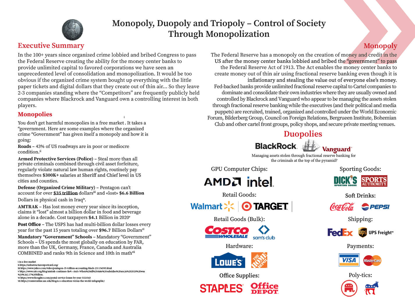 And that’s really what we’ve got right now is that they’ve been providing these cartel companies unlimited dollars, and those cartel companies have been buying up family businesses and mom and pop businesses and every kind of business to create a system where they can exercise control through BlackRock and Vanguard and State Street and these large private equity companies that are holding and you know that the ownership of the companies bought up with fractional reserve dollars and providing management to them and controlling the you know, who’s sitting in the C suite and who’s sitting in the CEO position.