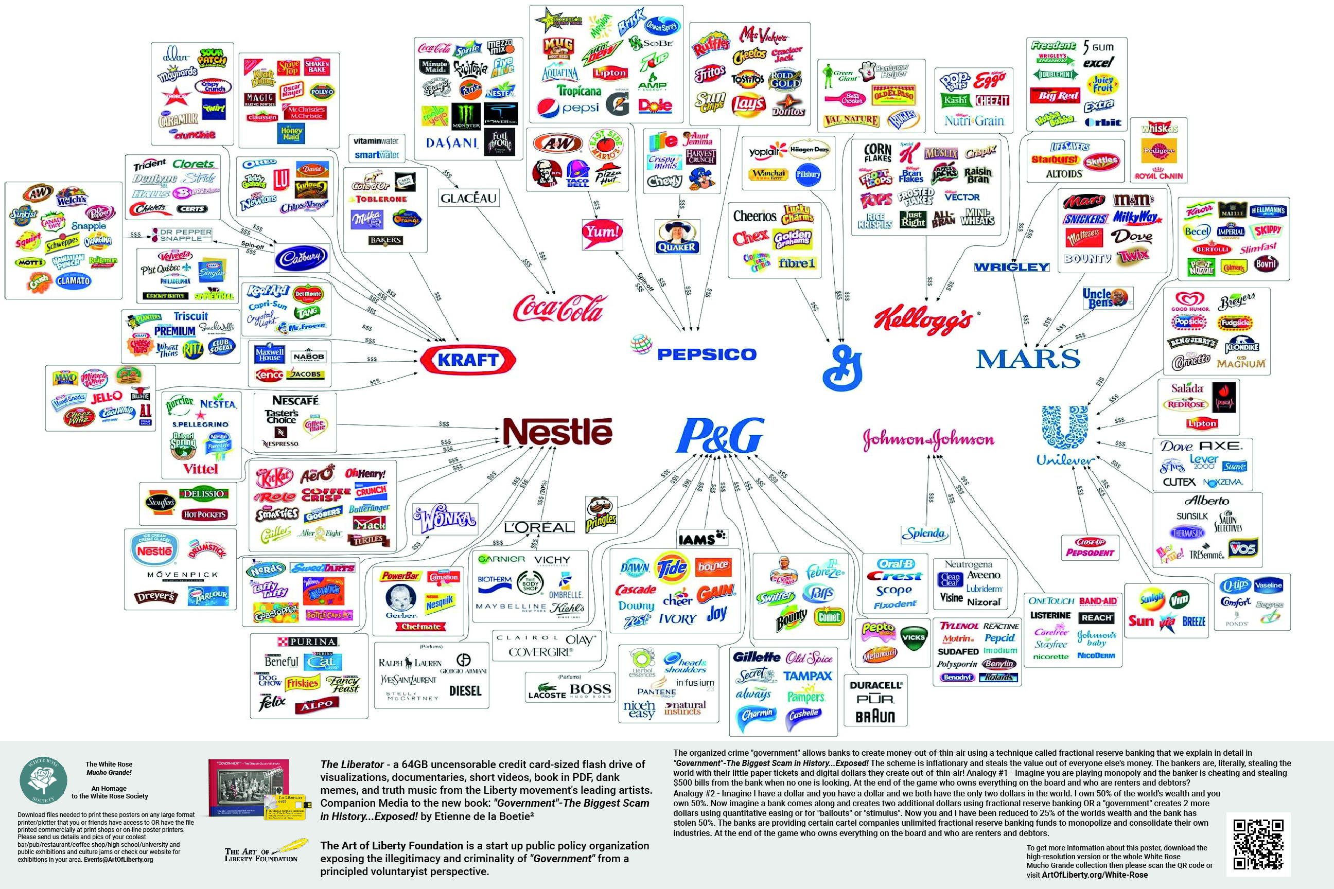 They’re providing certain, companies with unlimited funds to buy up and consolidate their own industries. And these are the dozen or so, you know, consumer product and food companies. This is the PepsiCo’s. This is the Unilever’s. This is the Colgate-Palmolive’s. This is the, you know, Coca-Cola company. This is Yum! Yum! Brands. I forget who owns Yum! Brands. It owns Taco Bell and others. And so we’re going to have these companies put harmful ingredients. We’re going to have them put addictive ingredients like glutamates into the food to make the food physically and psychologically addictive to the people that eat it. And so we’re going to poison the population. We’re going to keep them dumbed down.