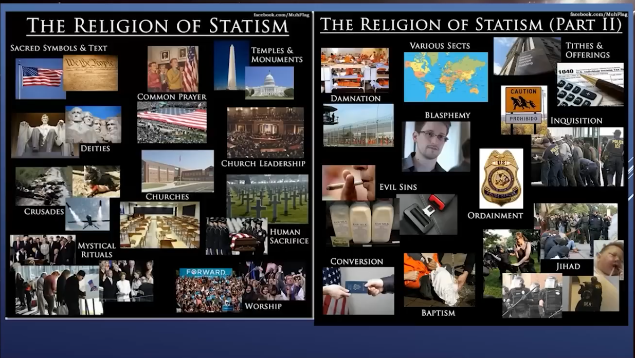 And so the basics of the religion, it’s called statism. And statism is the 100% indoctrinated belief in having a state or having a government. Nobody is born thinking that having a government’s a good idea, you’re taught it in the mandatory government school or the accredited private school or whatever it is. It’s 100% indoctrinated idea. So the government, the state is God.