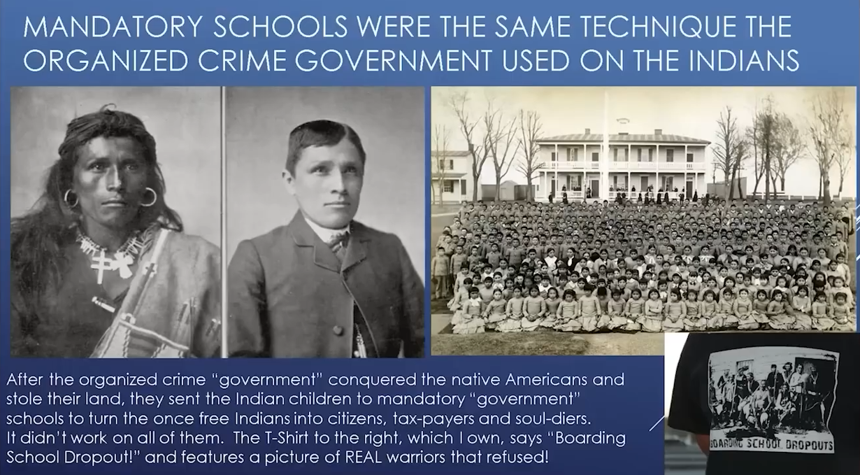 You don’t want to be the kid that he doesn’t do it kind of a thing. And they’re going to take independent human beings and they’re going to give them this worldview before they’re old enough to really evaluate the logic and the morality. Which, interestingly, is the exact same technique that they ran on the Indians after they conquered the Indians and after they stole the Indians’ land. And so if you know anything about like, you know, what happened in the frontier wars and everything is after they conquered the Native Americans and they stole their land, they would send the Indian children to mandatory government schools called Indian boarding schools, and they turned the once free Indians in one generation into quote-unquote citizens taxpayers and soldiers. And so it didn’t work on all of them.