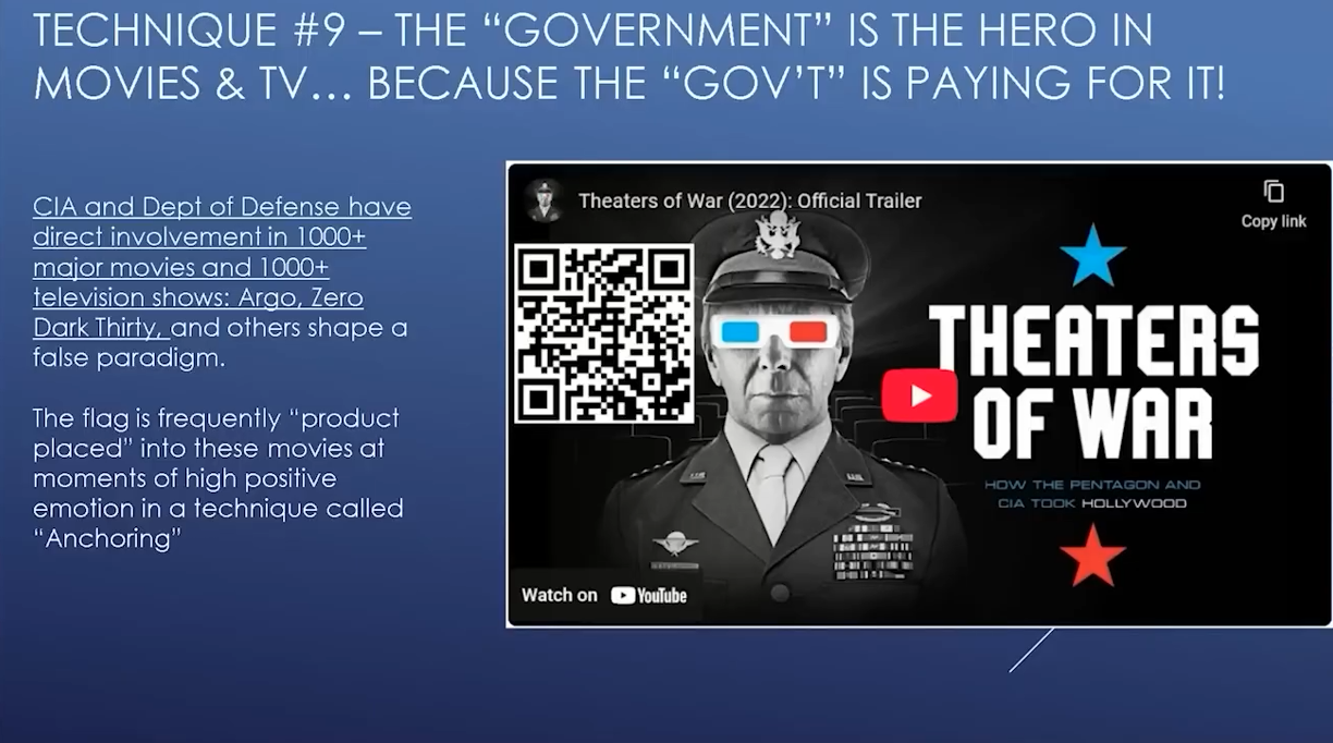 I wanna go back one to technique nine, which you mentioned earlier, where the government and the Department of Defense have direct involvement in over 1,000 major movies and 1,000 television shows that we know of. where they’re product placing the flag at moments of high positive emotion using this advertising technique called anchoring. And so they’ll build the audience up to a moment of high positive emotion. This is the trailer for a movie called Theaters of War. where they’re breaking down the scholarship behind all of these claims and how the Department of Defense has script control. And they’re actually changing history. And so, like, if you want to shoot a movie about Vietnam, you can’t have a scene about the My Lai Massacre. You can’t have a scene about a lot of the crimes that the troops committed in Vietnam, or you’re not going to get the money, or shoot on military bases, or military equipment, or anything that you want. The first part of the process is you give, the Pentagon actually has an office in Hollywood, and you have to give them your script, and then they read the whole script, and then they excise out, like, you can’t do this, you can’t do that. And then they give the script back to the director. And if the director wants the military bases or the extras or the F-18 jets, like in Top Gun Maverick, you’ve got to make the government look good.