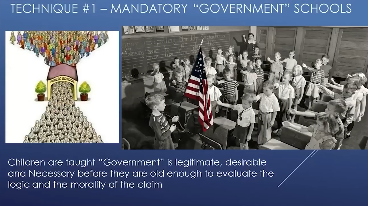 But that’s the basics of the religion. And the number one technique is the mandatory government school system. So they’re gonna force you into this worldview before you’re old enough to really evaluate the logic and the morality of is government legitimate, desirable, and necessary? They’re going to tell you that not only is it legitimate, desirable, and necessary, they’re going to get you pledging your allegiance to it in a religious worship of common prayer where there’s a social pressure to participate.