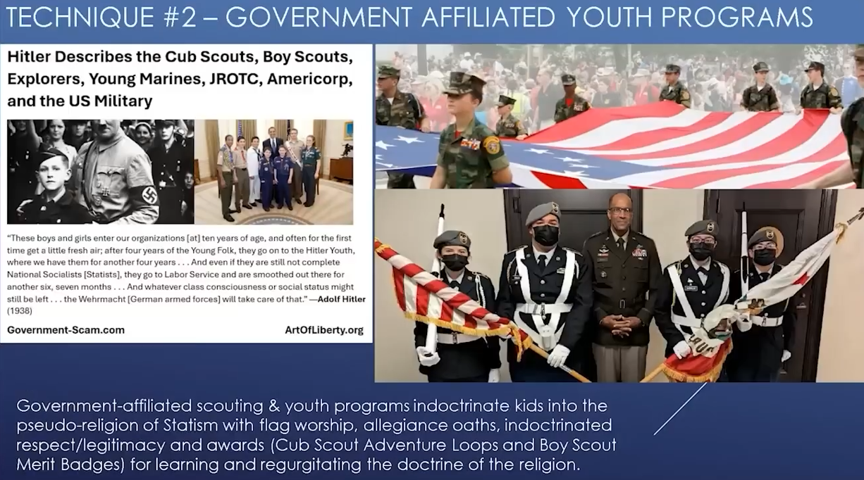 So that’s the government’s JROTC, ROTC, and military and police training. And by the time you go through the Cub Scouts, the Boy Scouts, the Explorers, the JROTC, the ROTC, military and police training, now you’re willing to set your morality aside and you’re willing to murder whoever you’re told.