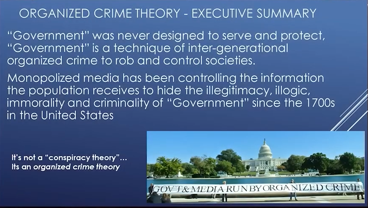 I’m just going to roll and just kind of take the audience through my presentation. But I guess the first thing that I would say is we call it, at the Art of Liberty Foundation, it’s not a conspiracy theory. It’s an organized crime theory, and the basics of organized crime theory I’ve already touched on. Government was never really designed to serve and protect. It’s a technique of intergenerational organized crime to rob and control societies. We don’t really need government. Monopoly media has been controlling the information the population receives to hide the illegitimacy, illogic, immorality, and criminality of the government. since the 1700s in the United States.