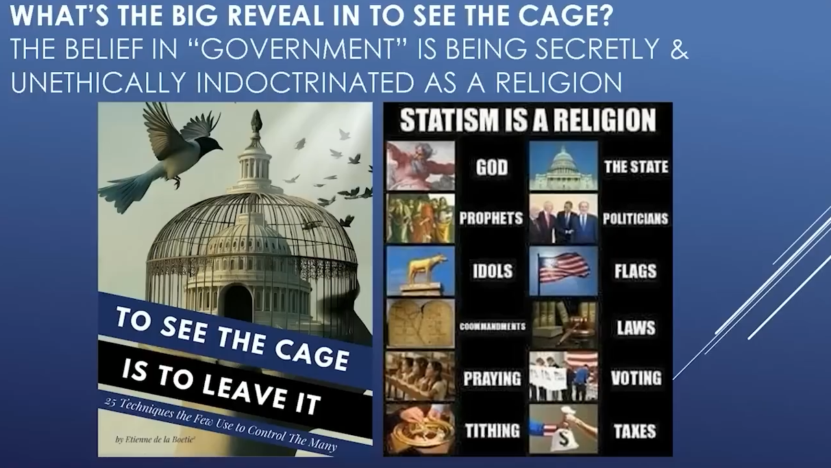 So what is the big reveal in my new book To See the Cage is to Leave It - 25 Techniques the Few Use to Control the Many? And the belief in government is being secretly and unethically indoctrinated as a religion. Now, they’re not calling it a religion, but they’re using all of the same tricks and techniques that an unethically manipulative religion or a cult would use on their followers.