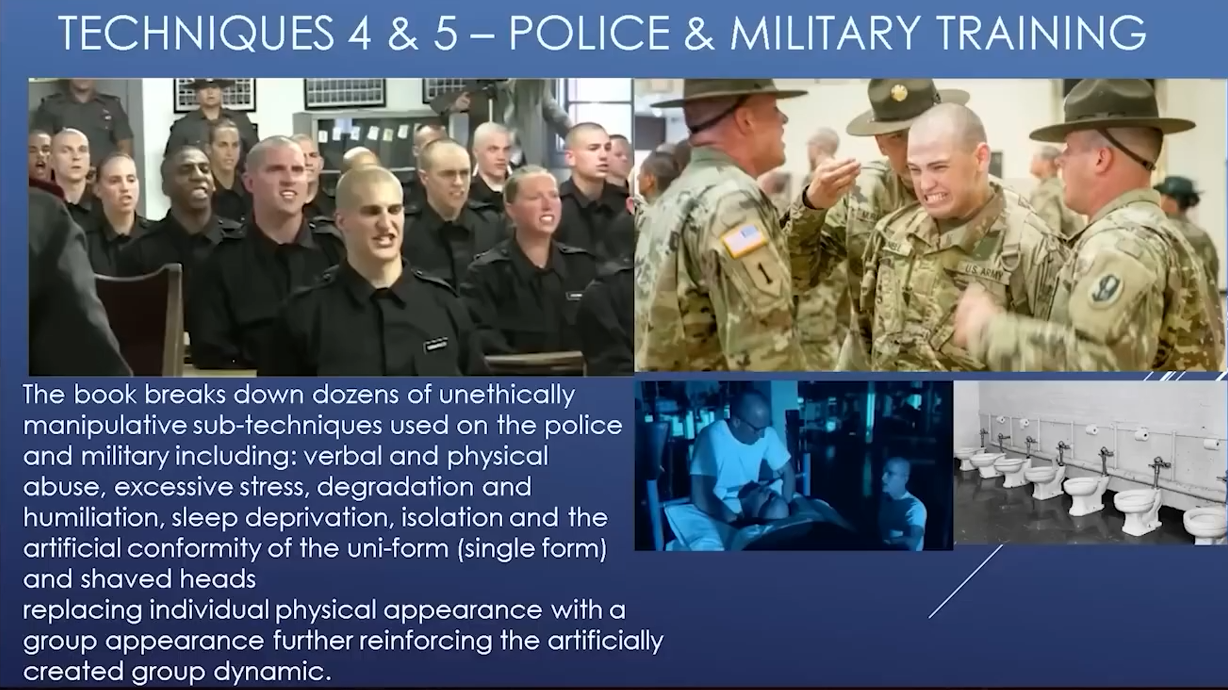 They’ve been indoctrinated that it’s legitimate, that they have rights that other people don’t, because they represent the government and they can use violence on peaceful people, even though it’s immoral, because they’ve been put through these various techniques. Now, we talked about the Cub Scouts and the Young Marines and everything like that, but really, they turn up the heat when it gets to the police and military. The police and the military, I could talk about dozens. I broke the police and the military in the book. We break down 25 techniques. But I, you know, I did one technique for the police, one technique for the military, but, but assumed under those are actually dozens and dozens of unethically manipulative techniques that are used on the police and on the military in their training to create this obedience. And these include verbal and physical abuse, excessive stress, degradation and humiliation, sleep deprivation, isolation, the artificial conformity of the uniform.