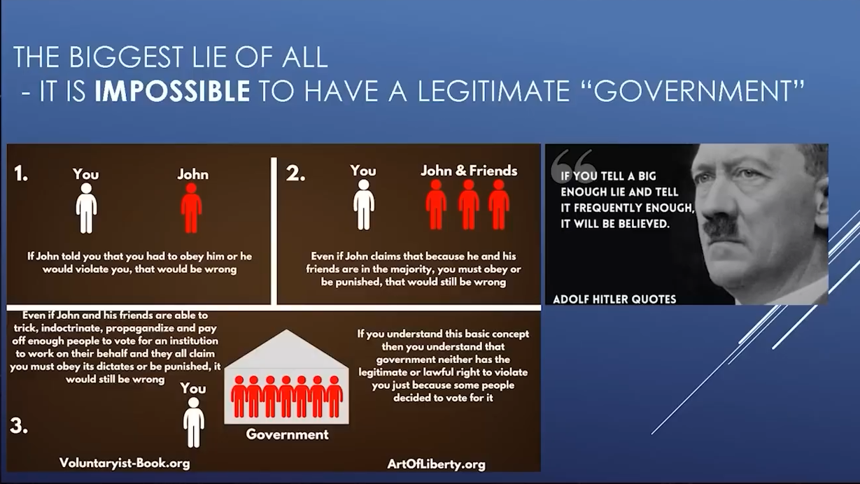 They’re going to learn the exact same thing. And really, the biggest lie, the basis of the whole thing, is this idea that it’s possible to have a legitimate moral government. I’ve got a little quote from Hitler: “If you tell a big enough lie and tell it frequently enough, it will be believed”. And so the idea is government is legitimate, desirable, and necessary, even though it’s impossible to have a legitimate government. What I mean by that is, And I’ve got like just a little visualization, you know, if John told you that you had to obey him or that he would violate you, that would be wrong. If John claims because he and his friends are in the majority. So if there’s two of, you know, if John comes to your door with two people and he said, or three people, and he’s like, well, there’s three of us. one of you and the three of us vote that you have to give us all your money, and that would be, of course, illegitimate. And so even if John and his friends are able to trick, indoctrinate, propagandize, and pay off enough people to vote for an institution to work on their behalf, and they all claim that you must obey its dictates, or be punished, it would still be wrong.