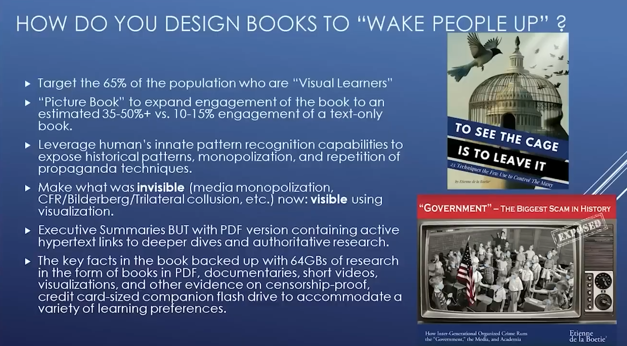 Like, no, you’re not. You’re getting propagandized and robbed. But to get that across to people, I create these books that have a lot of visualizations and memes and expand the amount of people that will read a book significantly versus a text-only book. And then I’m leveraging a lot of human beings’ innate pattern recognition capabilities to expose the historical patterns, the monopolizations, the repetition of the propaganda techniques.