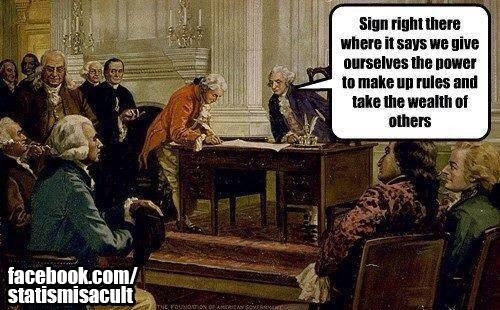 You can’t be bound by this social contract that you yourself did not sign, that the people that signed the Constitution, I mean, they can be bound by it. They can all agree that they’re going to participate under the rules that they just created, but nobody else can really be bound by it. Now, in the book, what I do is I do a lot with memes and visualizations, and so here is a meme, and for the people that aren’t looking at the presentation, it shows the signing of the “Con-stitution”, and James Madison is leaning over the table at one of the delegates of the 1787 Philadelphia Convention, and he says, sign right there, where it says we give ourselves the power to make up rules and take the wealth of others.
