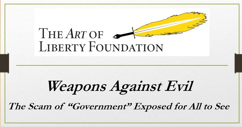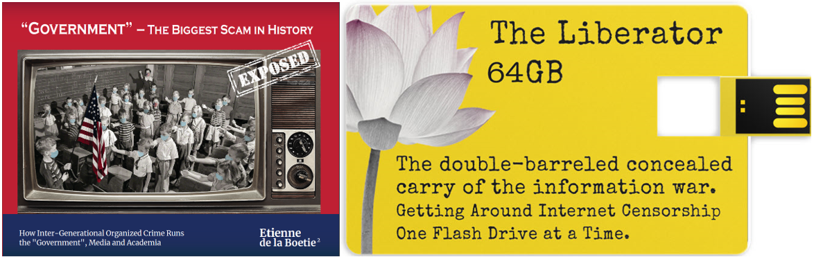 Weapons Against Evil - “Government”- The Biggest Scam in History… Exposed! - The book designed to wake up your friends, neighbors and colleagues by leveraging the way people learn, and The Liberator - The 64GB credit card-sized flash drive backing up the book.