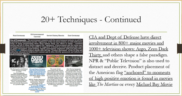 The use of propaganda. Okay. CIA and the Department of Defense have been directly involved in 800+ major movies and 1000+ television shows. Argo, Zero Dark Thirty, and others shape a false paradigm. NPR and public television are also used to distract and deceive product placement of the American flag anchored to moments of high positive motion are found in movies like the Martian and every Michael Bay movie.