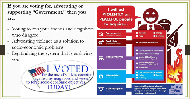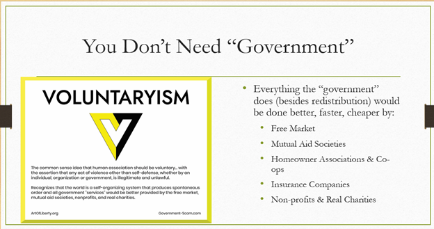 We've already really talked about that you don't need government and a little bit about voluntaryism. I will tell you voluntaryism is the rebrand of anarchy, and if that scares anybody, that's because they've changed the meaning of the word anarchy over time.