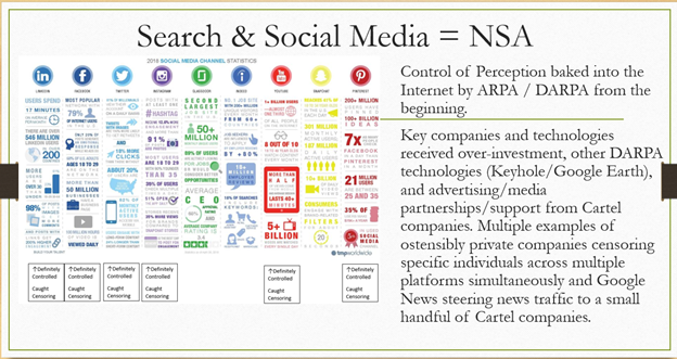 And so it's not a theory that these companies are lying to you and controlling the information you receive algorithmically. It has been proven through the releases of what are called the Twitter files. Key companies and technologies in the beginning received overinvestment. Other DARPA technologies, such as Google Earth, were a military program called Keyhole Satellites. Advertising and media partnerships, support from cartel companies, multiple examples of ostensibly private companies censoring specific individuals across multiple platforms simultaneously, and Google News steering news traffic to a small handful of cartel companies.