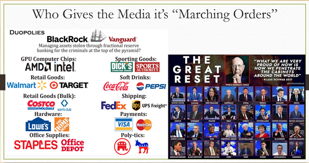So, who gives the media its marching orders? So it's the banks on the top. I believe I'm speculating, right now, I'm going to tell you what I can prove, and then I'll tell you what I can't, you know, what's speculation. But what I believe is that the banks are providing certain firms with unlimited funds to buy up and monopolize their competition. That ownership is being concentrated into BlackRock and Vanguard and State Street and a couple of other large, you know, asset managers. It would be obvious if they just left one company, so they're going to leave two.