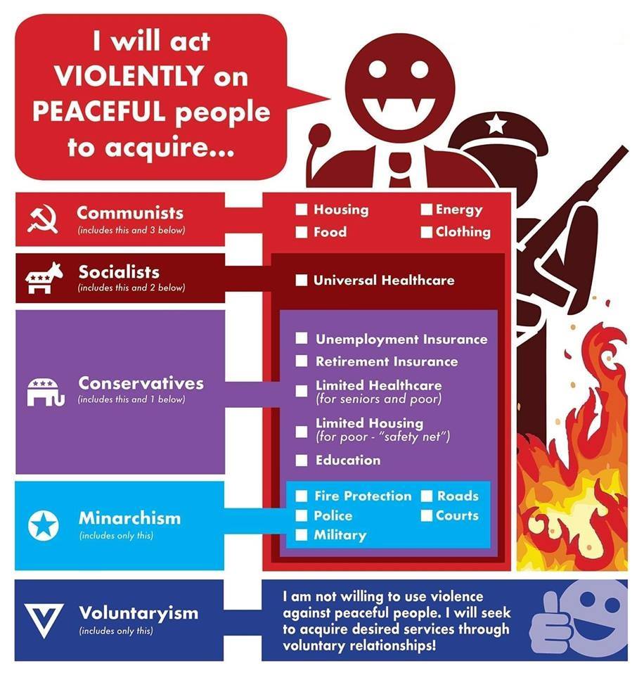 The diagram up here, for those who can't see it, shows essentially smaller boxes. And so, you know, minarchists, people who are strict constitutionalists, believe that the government must act violently on peaceful people to acquire fire protection, police, military, roads and courts.