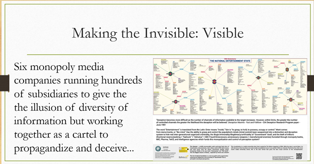 And the value here is, you know, if you told your friends and family that there were six monopoly media companies running hundreds and hundreds of subsidiaries to give everybody the illusion that there's all these information sources in society, maybe they'd believe you. You show them a media ownership chart, and they're like, “holy crap, there's six companies running hundreds of subsidiaries to give everybody the illusion that there's all these information sources in society” …because they saw it with their own eyes. And when they saw it with their own eyes, that made it visible