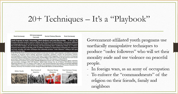 Youth programs to teach citizenship, blind obedience, and state flag worship. The Cub Scouts, the Boy Scouts, are designed to produce something called an “order follower”, and an order follower is someone that's going to set their morality aside and either use violence against peaceful people, to enforce the edicts of this artificially indoctrinated religious system, or they're going to use violence in foreign wars based on lies and manufactured intelligence to steal resources.
