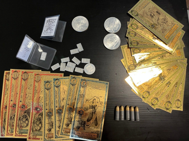 I'm an ex-Wall Street guy. I'm worried about a dollar devaluation or even a collapse. I'm not here to scare anybody. I'm just saying it just makes sense to have some of these solutions. I'm gonna pass around, so this picture right here when we were vending at the Porcupine Freedom Festival, the community is so large that we took almost $400 in something called a gold back. I'm gonna pass this around. It's flexible, spendable gold. And also in kind of silver barter pieces and silver coins. And so I'm just gonna kind of like pass these around just if you've never touched a gold back or you've never seen what silver barter silver looks like. Get it back to me at the end.