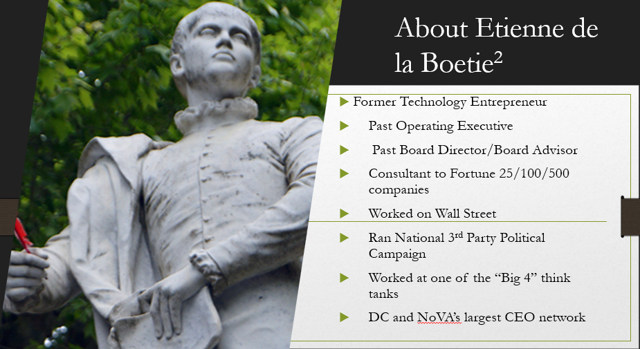 “So first of all, for those unfamiliar with me or my work, my nom de plume is Etienne de la Boetie2. I use the exponent to denote that I'm not the original Etienne de la Boetie. He was a French political philosopher who wrote in the 16th century. He was the first one to expose the little tricks and the techniques that rulers use, not just to get obedience but to get fealty and adoration. God Save the Queen and All Hail the Chief and to trick people into going along with something that is not in their interest.