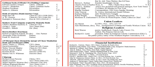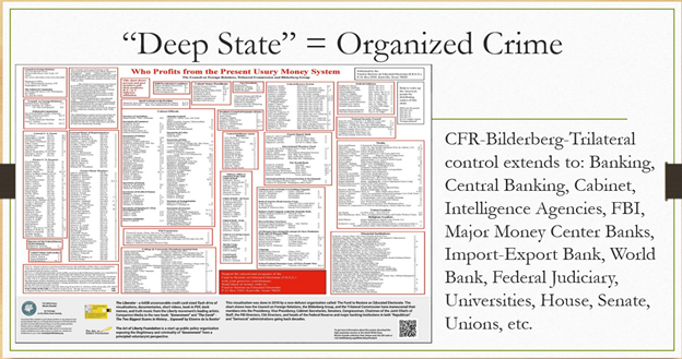 Well, the Council on Foreign Relations was the first group that developed “Penetrating the Cabinets,” and the House of Representatives, the Senate, the head of the CIA, the head of the FBI, the Joint Chiefs of Staff, and the International Monetary Fund, and the World Bank, and the media, universities, the Federal Reserve System, and then the key little area of the chart right here: