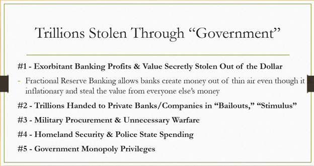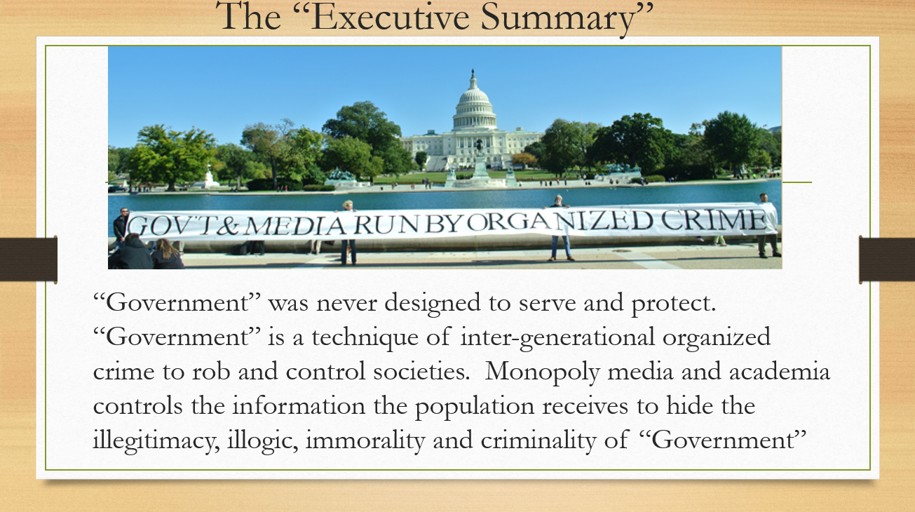 But the “executive summary of the executive summary” is that government was never designed to serve and protect. Government is a technique of intergenerational organized crime to rob and control societies. Monopoly media and academia control the information the population receives to hide the illegitimacy, the illogic, the immorality, and the criminality of government.