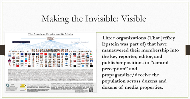 .This is another visualization from the book. These are three organizations that Jeffrey Epstein was a member of that have maneuvered their members into the key reporterships, editorships, and publisher positions to control perception and propagandize and deceive the population across dozens and dozens of media properties.