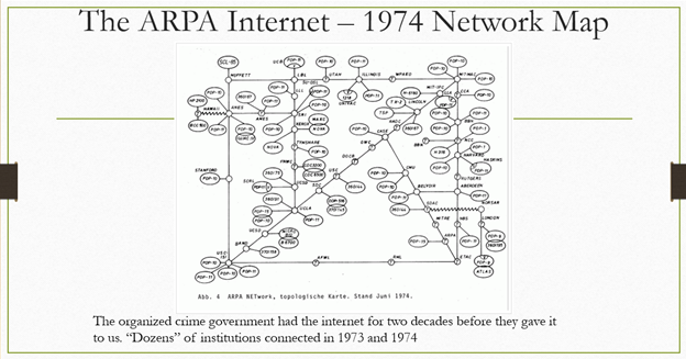 This is a diagram from 1974 before DARPA, the Defense Advanced Research Project Agency, there was ARPA, the Advanced Research Project Agency. This is a network map from 1974 showing dozens and dozens of institutions connected to the internet in 1974. So by the time they released it to the public, they'd already figured out what technologies they had to control to widely control perception on the, what I like to call “the DARPA internet”.
