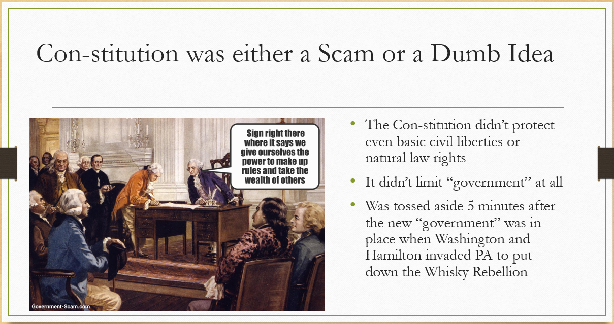 And so this is very unpopular with some people, but it's the stone-cold truth. The Con-stitution was either a scam or a dumb idea. And what I mean by that is the Constitution was not able to protect even the basic civil liberties outlined in the Bill of Rights, or the natural law, inherent rights of others. If you don't believe me, try and go through the airport without getting your bags searched or try and tell the policeman no when he wants to search your car, or when they do their little trick and signal the drug dog to alert, or I could give you a gazillion other examples.