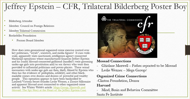 And so it's the illusion of choice. I mentioned that Jeffrey Epstein was a member of the CFR, the Trilateral Commission and Bilderberg, and I think he should be their poster boy. In addition to controlling the information people receive, there appears to be a program to blackmail and control prominent individuals and politicians. Jeffrey Epstein was caught doing it at a factory-scale level.