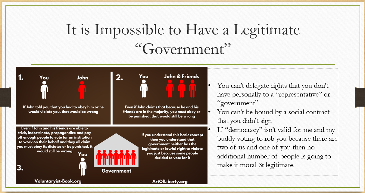 First, you must understand that it's impossible to have a legitimate government. Looks good on paper. Sounds good, but it's impossible if you want to be a moral person, if you want to be a logical person. You simply can't delegate rights that you do not have personally to a representative to represent you doing something you cannot do yourself. You can't be bound by a social contract you didn't sign.
