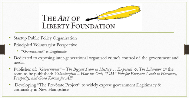 Finally, my organization is the Art of Liberty Foundation. We're a startup public policy organization. We're trying to build a think tank along the lines of a Heritage or a Brookings or a Cato from a principled, voluntarist perspective that government is illegitimate and dedicated to exposing. We don't have a political problem. We have an organized crime problem. And most people, they're trying to get you to look over here, look over there. We're not We're not going after the cape, we're going after the matador.