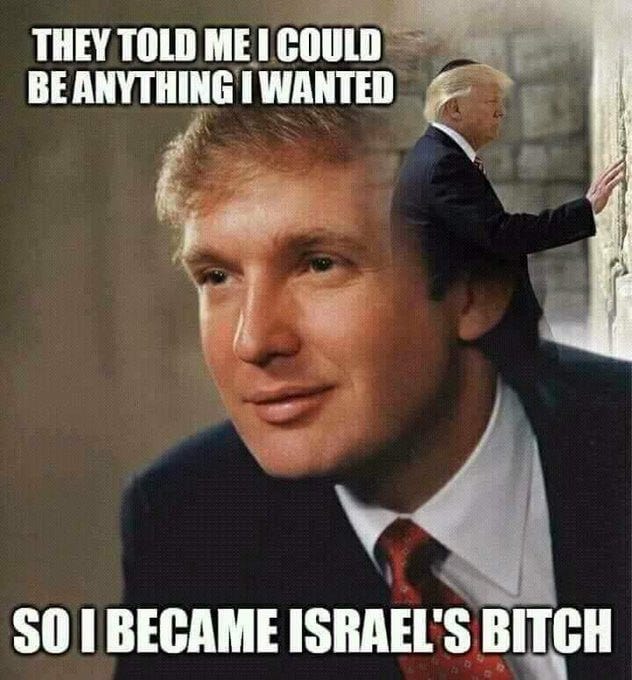 Etienne de la Boetie² For Israel and for his own personal building up his own personal wealth in crypto scams and in real estate scams, and what’s going on with the Trump resort in a hotel in Saudi Arabia, and what’s going on with receiving $400,000,000 jets.