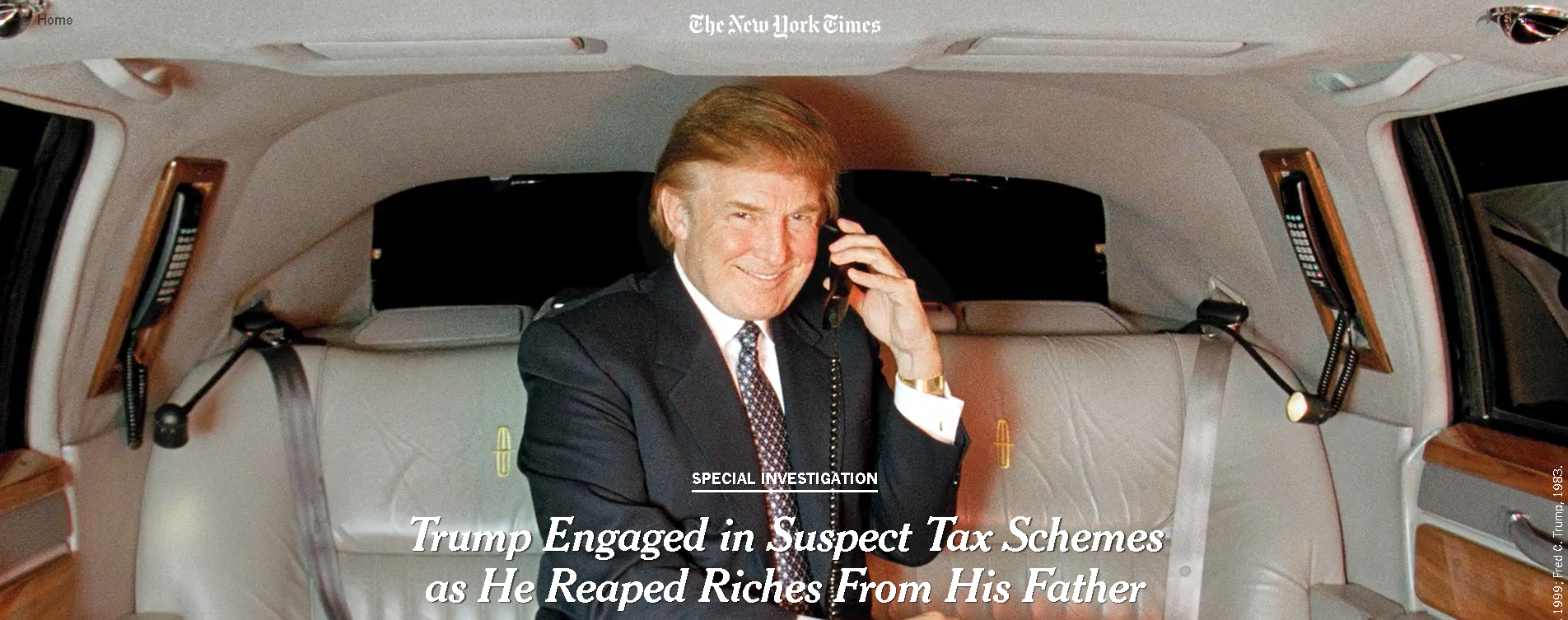 The New York Times investigation linked below, “Trump Engaged in Suspect Tax Schemes as He Reaped Riches From His Father,” exposed that Trump has lied about starting with just a $1M dollar investment from his father and actually has received over $400M. The investigation was published in October 2018, won the 2019 Pulitzer Prize for Explanatory Reporting.