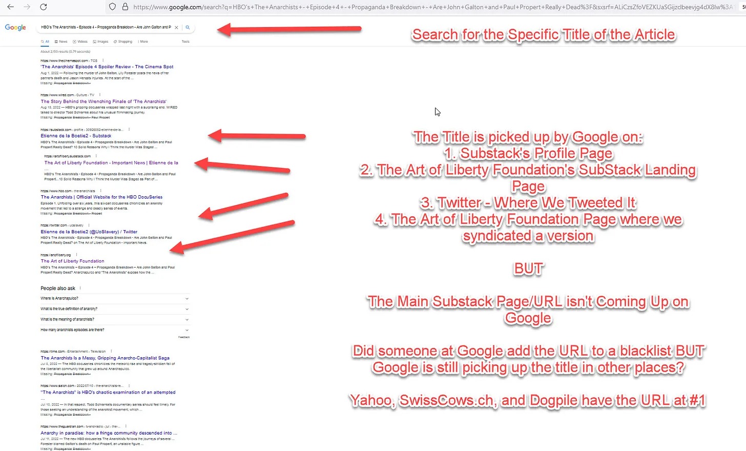 If you search on SwissCows.ch, Yahoo.com, or Dogpile.com for the search terms: “the anarchists HBO episode 4 review”. My article on Substack is the #1 search result.