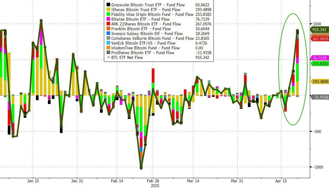 US spot Bitcoin ETFs had over $912 million worth of cumulative net inflows on April 22, marking their highest daily investment in more than three months since Jan. 21...