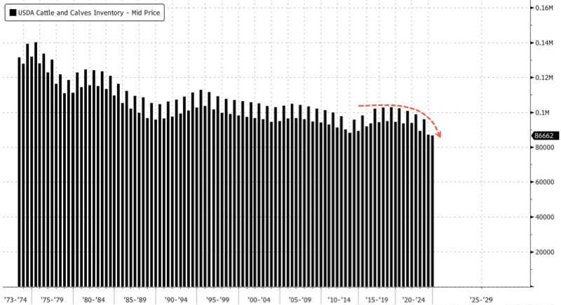America's declining cattle herd is nothing short of alarming, and some ranchers call it a "national security threat" to the nation's food supply chain. This continues to be a major theme fueling record-high cattle prices on the Chicago Mercantile Exchange and beef prices at the local supermarket. Elevated interest rates and soaring input costs under the Biden-Harris regime years have made it increasingly difficult to maintain or rebuild herds—challenges that are expected to persist early in President Trump's second term.