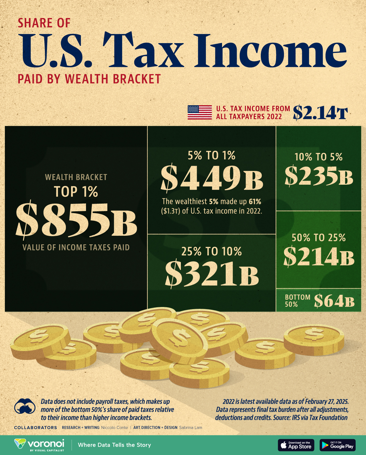 The U.S. federal government collected $2.14 trillion in income taxes in 2022, funded primarily from the highest wealth brackets.