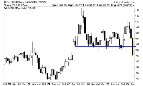 The greenback has collapsed over 10% in the last two months. The driving factor has been investors fleeing the U.S. and its currency in response to the Trump administration introducing an aggressive trade war.