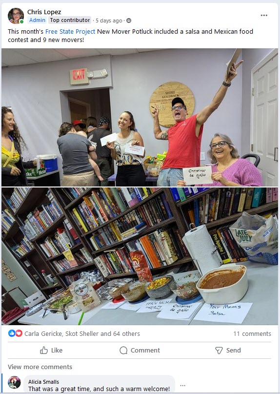 There is a "New Mover Party" every month in Manchester. It is a great gauge on how many people are moving to NH. New "Porcupines" land all over the state but Manchester has the highest concentration and gets the most new movers. Since I began pestering my friend Chris Lopez to update me each month the average has been 3-5... This month was nine! The venue was The Quill, one of at least four liberty clubhouses in New Hampshire... See the amazing library behind the buffet... among other liberty titles, you can find "Government" - The Biggest Scam in History... Exposed! The best-selling book promoting the Free State Project!