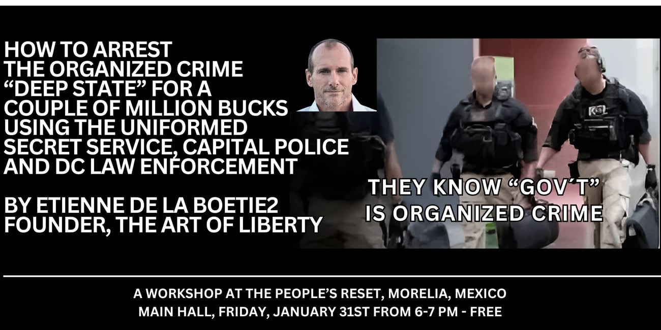 I am going to be speaking at The People's Reset Conference in Morelia, Mexico January 29th-Feb 2nd. I will give a mainstage keynote on Voluntaryism and a workshop talk on an idea I have to cost-effectively arrest the organized crime "deep state" using the uniformed secret service who already know "government" is run my organized crime. Want to join us?Use this link to support the Art of Liberty: https://thegreaterreset.org/aff/35/