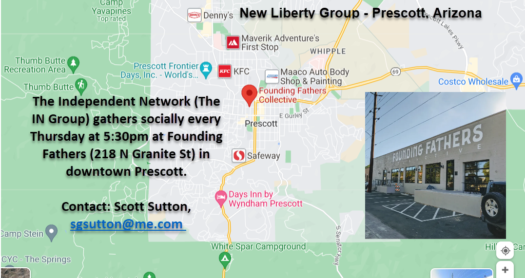 The Independent Network (IN) is Prescott's home for kind-hearted, skeptically-minded people who value peace, freedom, and good, old-fashioned fun. In this local group, members make new friends, learn from one another, and take practical steps toward self-empowerment, mutual aid, and human flourishing.We gather socially every Thursday at 5:30 pm at Founding Fathers (218 N Granite St) in downtown Prescott. In addition to building community, members are welcome to discuss consequential current events and other essential topics in a respectful, truth-seeking, free-speech environment. For example, if you're engaged in a positive self-help project (e.g., health, finance, personal independence), or you have a creative idea to push back against the authoritarian tide peacefully, you'll have a forum to express yourself freely.The IN group is a non-partisan, self-organizing, voluntaryist organization. Members are encouraged to initiate activities and lead by example while also respecting the rig...
