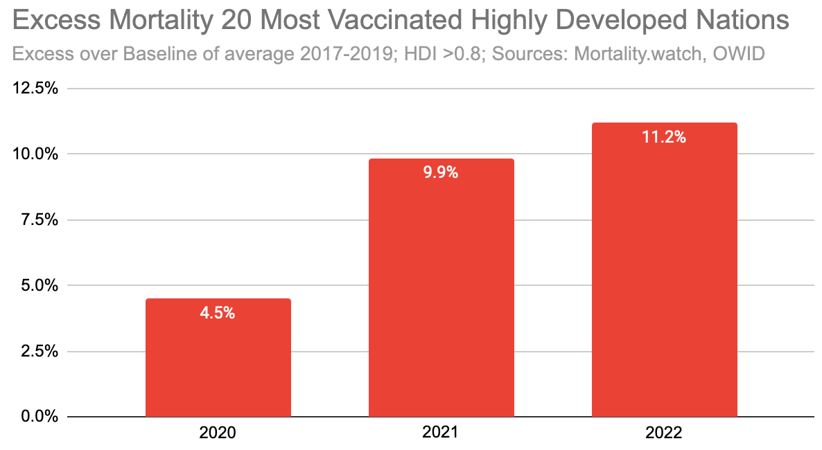 In 2020 median excess mortality in the top 20 highly developed countries was +4.5%, with the mass vaccine rollout in 2021, it increases to +9.9% and even further deteriorated in 2022 to +11.2%.