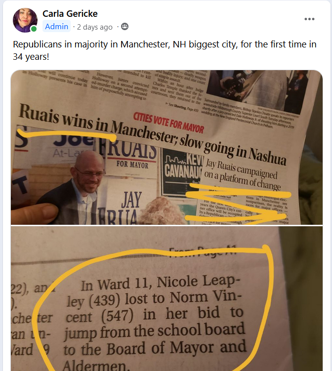 From Carla Gericke: For newer Free Staters... why celebrate Republican wins? Because in NH, Republicans and Free Staters are closely aligned, seeking free market, small-government solutions. Free Staters are elected as Republicans, and go on to serve in leadership and on important committees. Manchester's new mayor, Jay Ruais, isn't the best on some issues we care about (e.g. cops and qualified immunity) but he is open to alternative solutions to problems, which provides us with the opportunity to guide the development in the City. For this to happen, we have to show up. So... if YOU live in Manchester, block off every other Tuesday to attend the BOMA meetings. Let's take charge!
