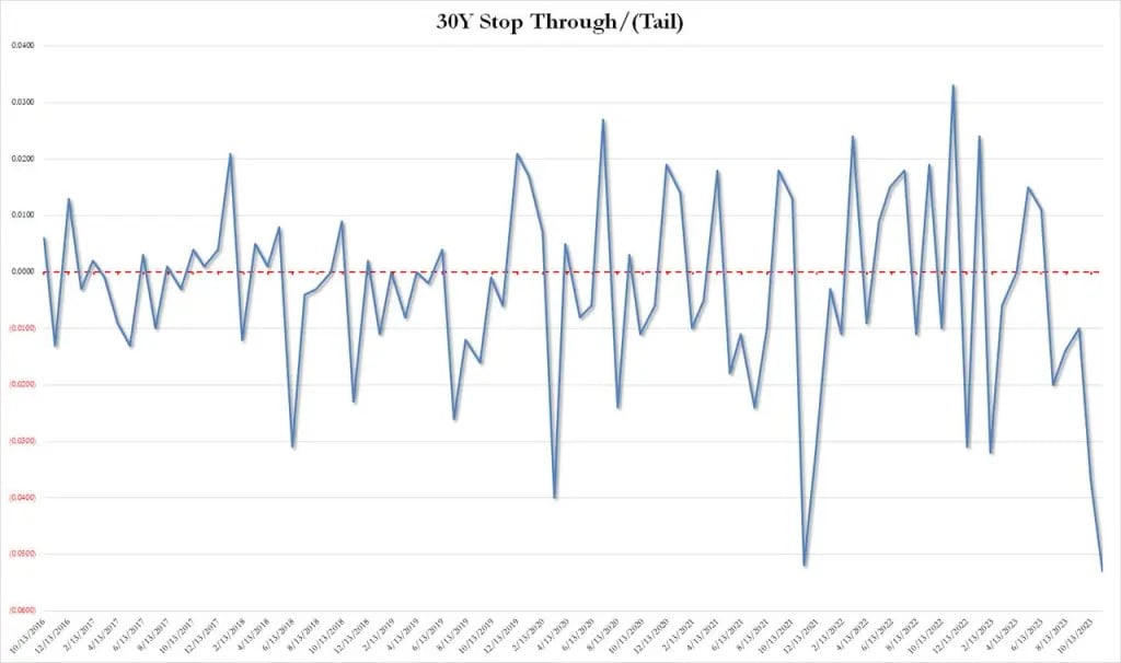 The bond priced at a high yield of 4.769%, which was below last month's 4.837%, and just shy of the April 2010 high. But more importantly, it tailed the When Issued by a whopping 5.3bps, which was& well& terrible, because as shown in the chart below, this was the biggest tail on record (going back to 2016).The bid to cover was just as bad: at 2.236 it was the ...