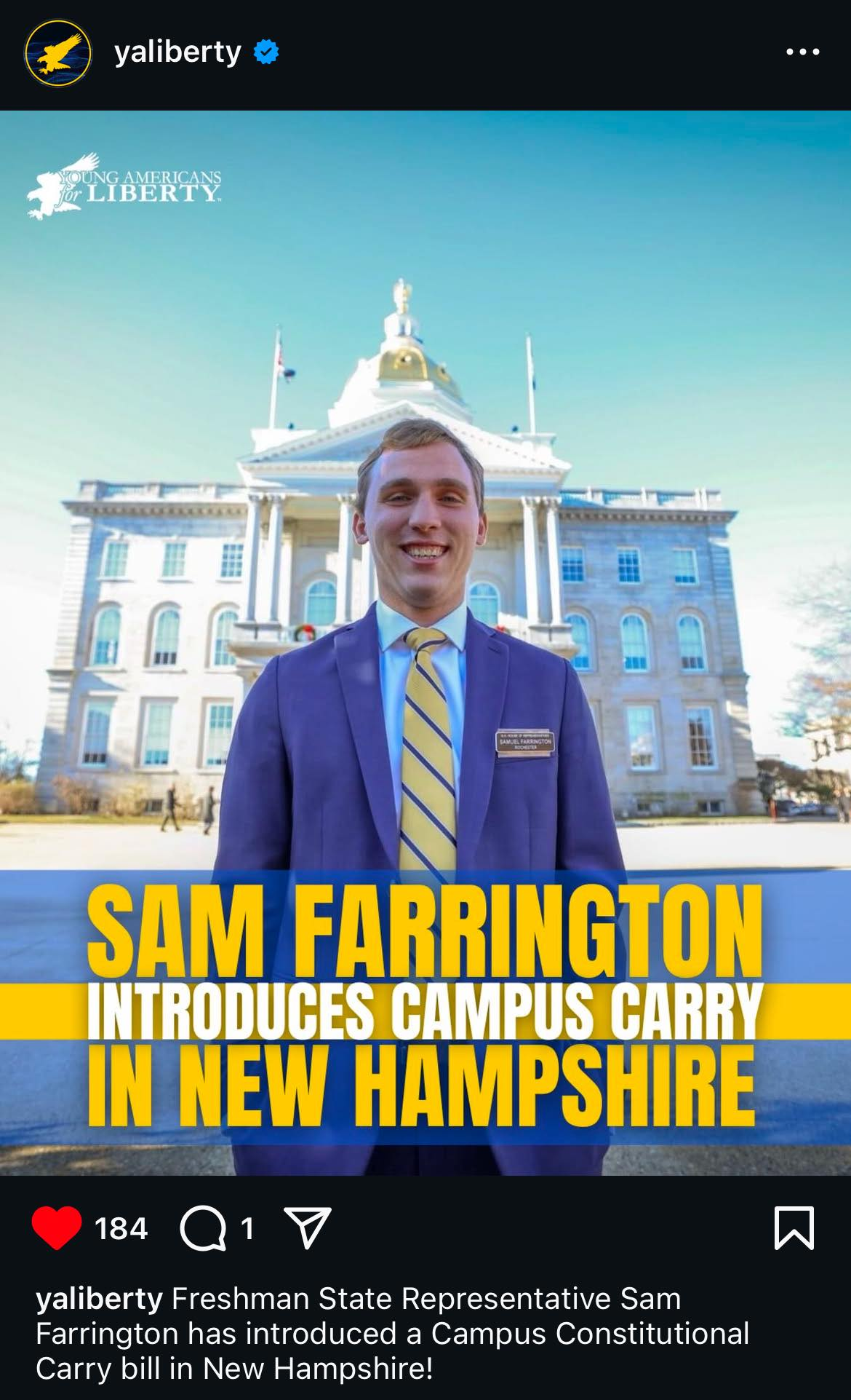 Freshman State Representative Sam Farrington has introduced a Campus Constitutional Carry bill in New Hampshire!