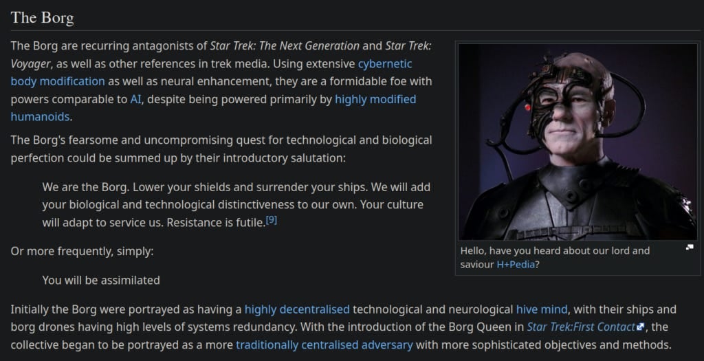 A cyborg is a life form that has technology integrated with its biology. Note, the agenda actually spans all life forms and resources. It was a choice to focus only on people in this article.